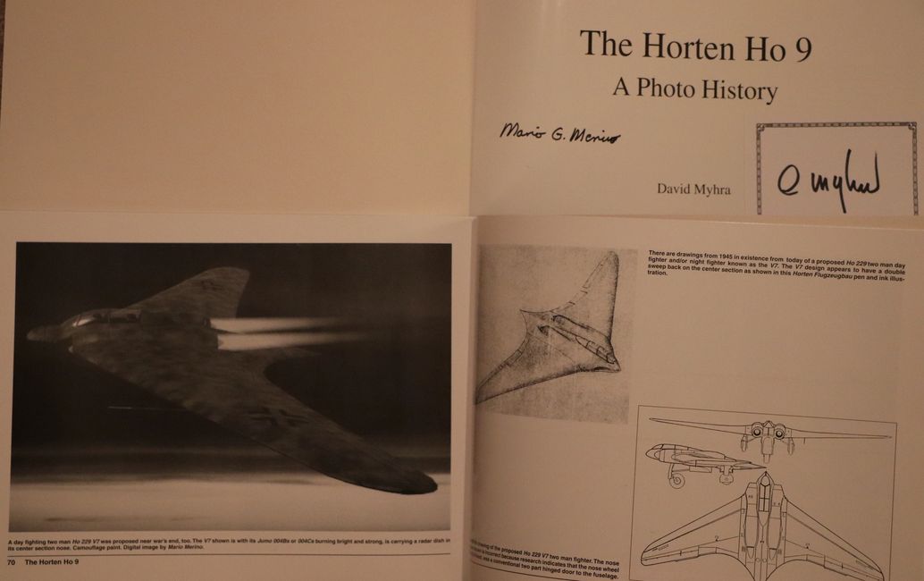 We had some extra copies of this 79 page book from the after-party following our presentation at EAA Oshkosh AirVentrue in July, 2019 featuring Diego Horten, son of Horten Ho 229 / 9 designer Reimar Horten, Terry Coakley, founder of this website, illustrator and animator Mario Merino, and Berrnhard Mattlener from Horten Aircraft. 100% of the proceeds (other than US shipping which is included) will go to the conservation and attachment of the wings of the Horten 229 V3 now on display at The Smithsonian Air & Space Udvar-Hazy Center. For shipping to other countries, consult our contact email at the bottom of our home page.